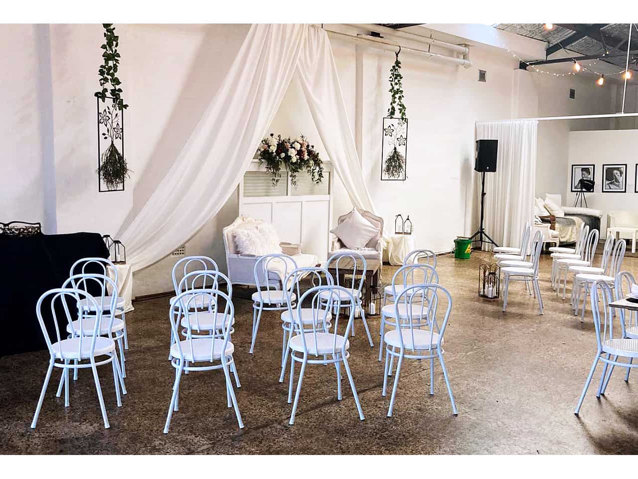 It’s easy to see why The Freedom Hub is an event dream. Nestled amongst the industrial structures of bustling Waterloo, it’s a stunning, illuminated warehouse cafe and venue for hire in shades of uplifting white. Stepping inside, the eye is drawn upwards to pitched ceilings and the multitude of fairy lights hanging aloft from exposed steel beams. The magnificent floor-to-ceiling windows and some well-placed skylights ensure that the place positively glows with natural light. Then there is the unique 100-year-old concrete floors with hand crushed river pebbles.